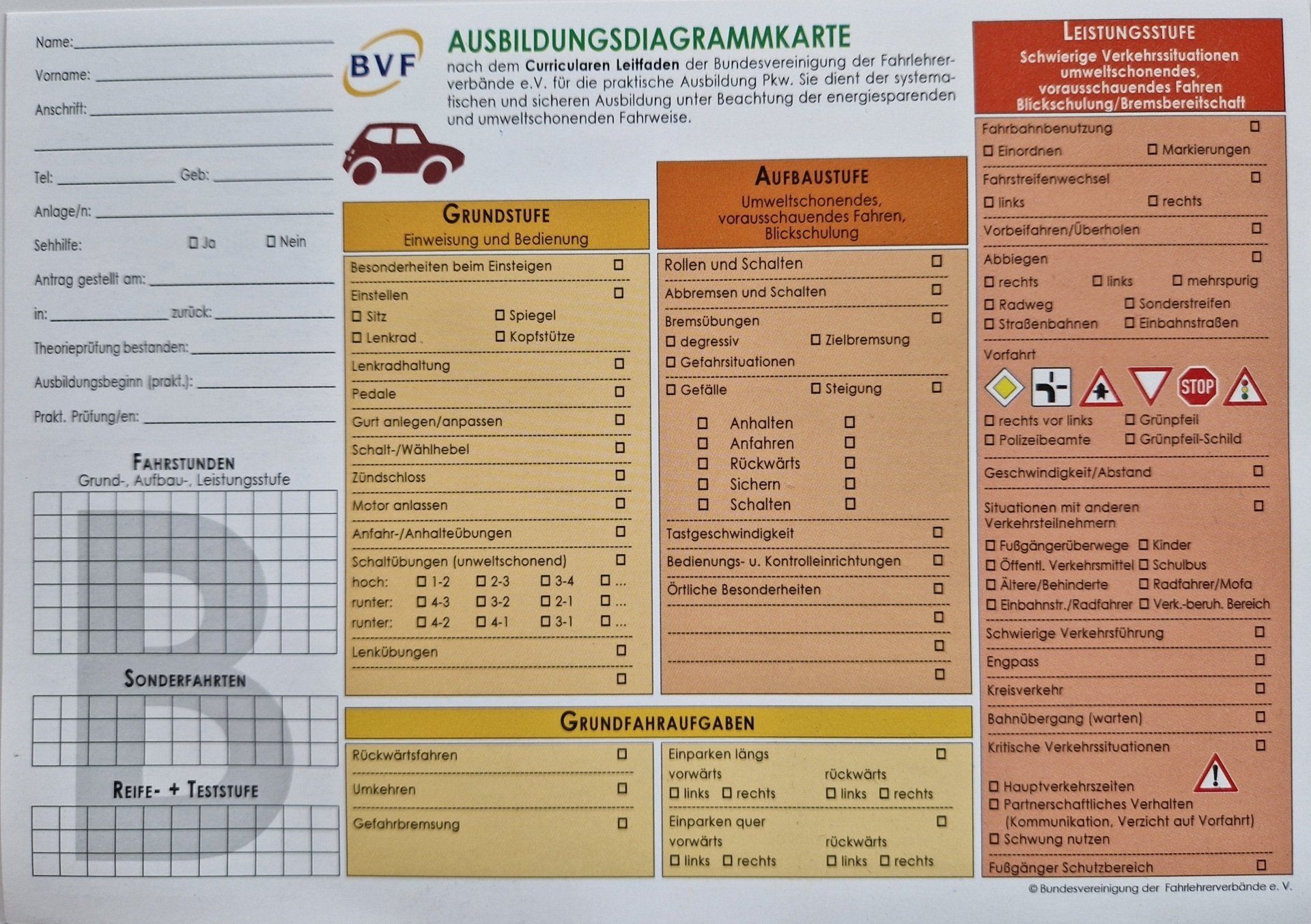Wir gestalten die Ausbildung jedes Einzelnen abgestimmt auf seine Fähigkeiten und Fertigkeiten individuell. Wir dokumentieren den Lernfortschritt um Ihnen maximale Transparenz zu bieten. Damit ist auch ein Fahrlehrerwechsel kein Problem, falls das einmal nötig sein sollte. Ihre Diagrammkarte mit den jeweiligen Aufzeichnungen ermöglicht eine schnelle Übersicht über Ihren Ausbildungsstand.